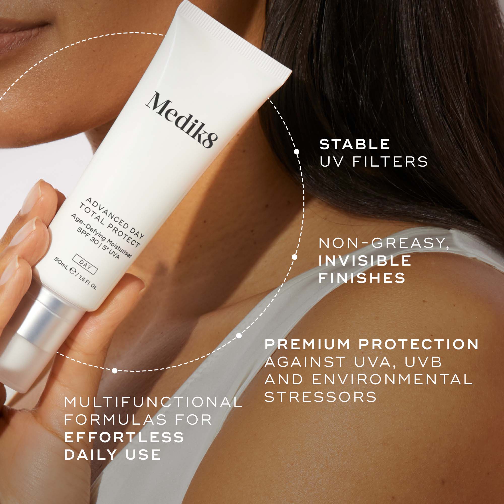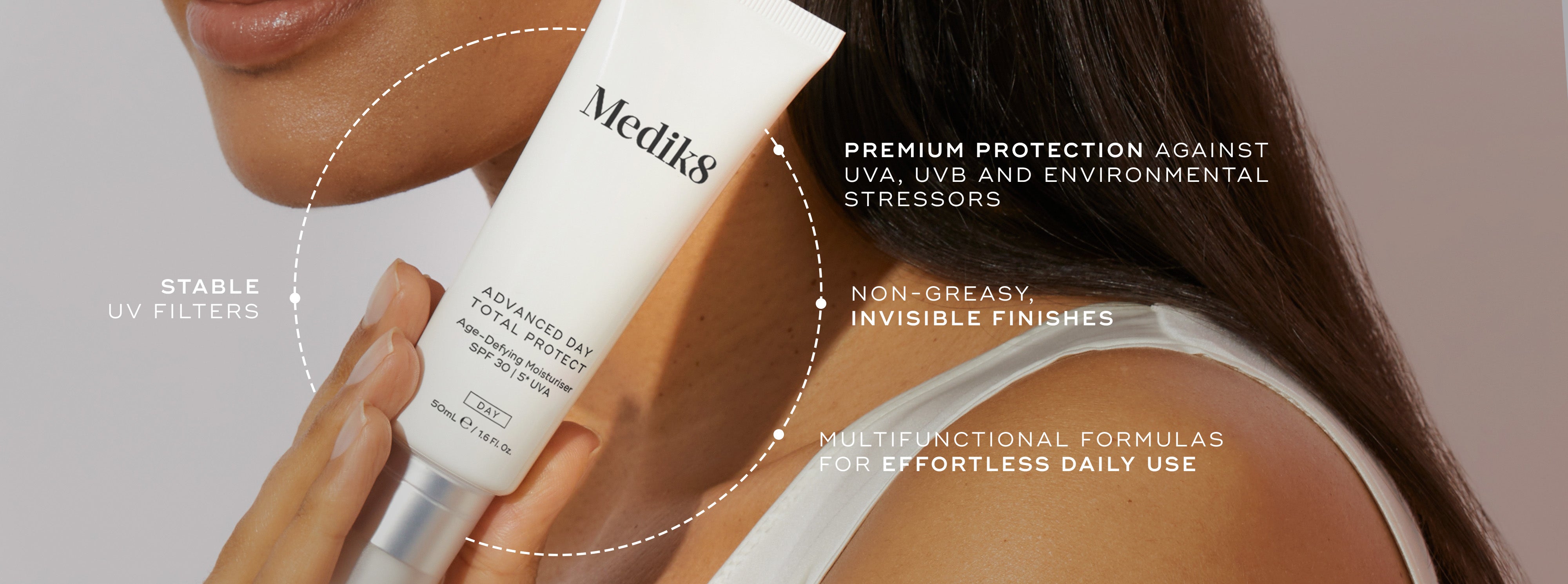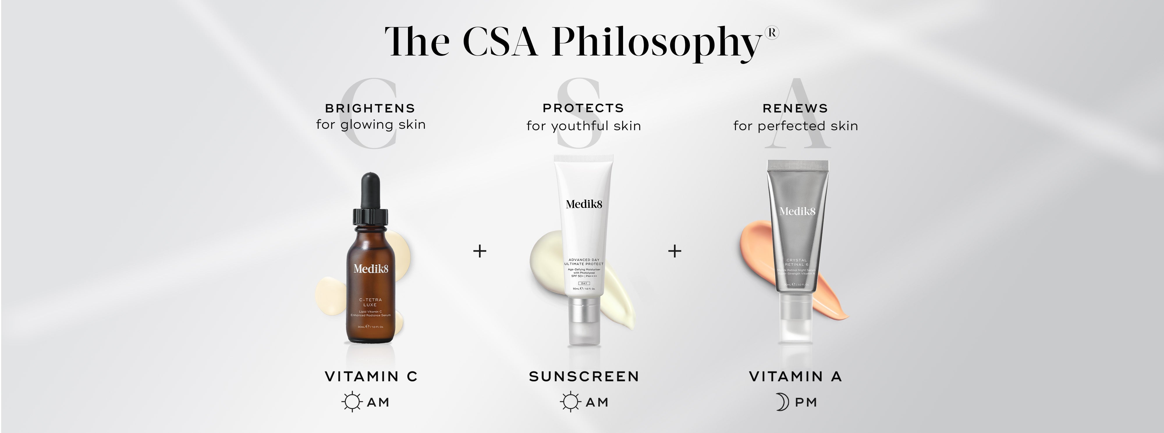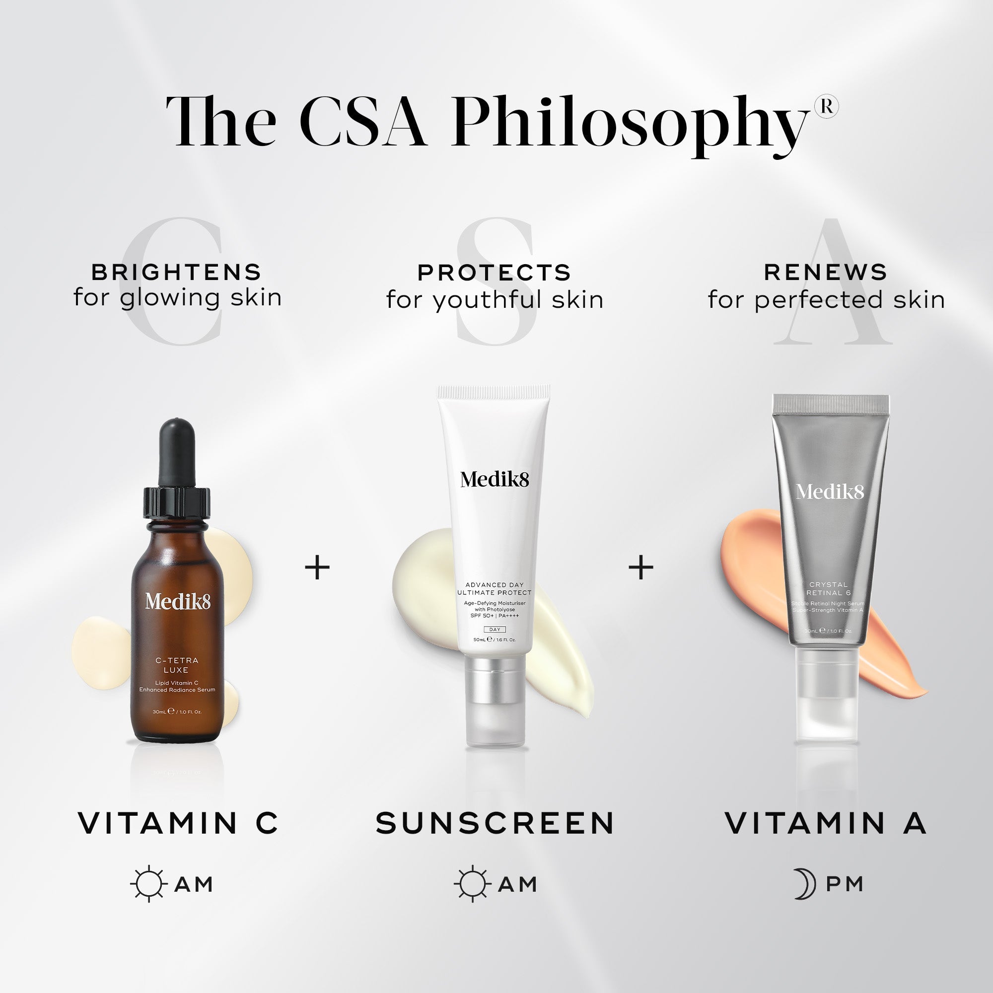 Verhoog de zichtbare jeugdbehoudende voordelen van zonnebrandcrème door deze te combineren met vitamine C en vitamine A - volgens Medik8's baanbrekende CSA PhilosophyⓇ, die vitamine C plus zonnebrandcrème aanbeveelt voor overdag en vitamine A voor 's nachts. Volg deze eenvoudige, klinisch bewezen benadering voor een stralende, jeugdige huid.