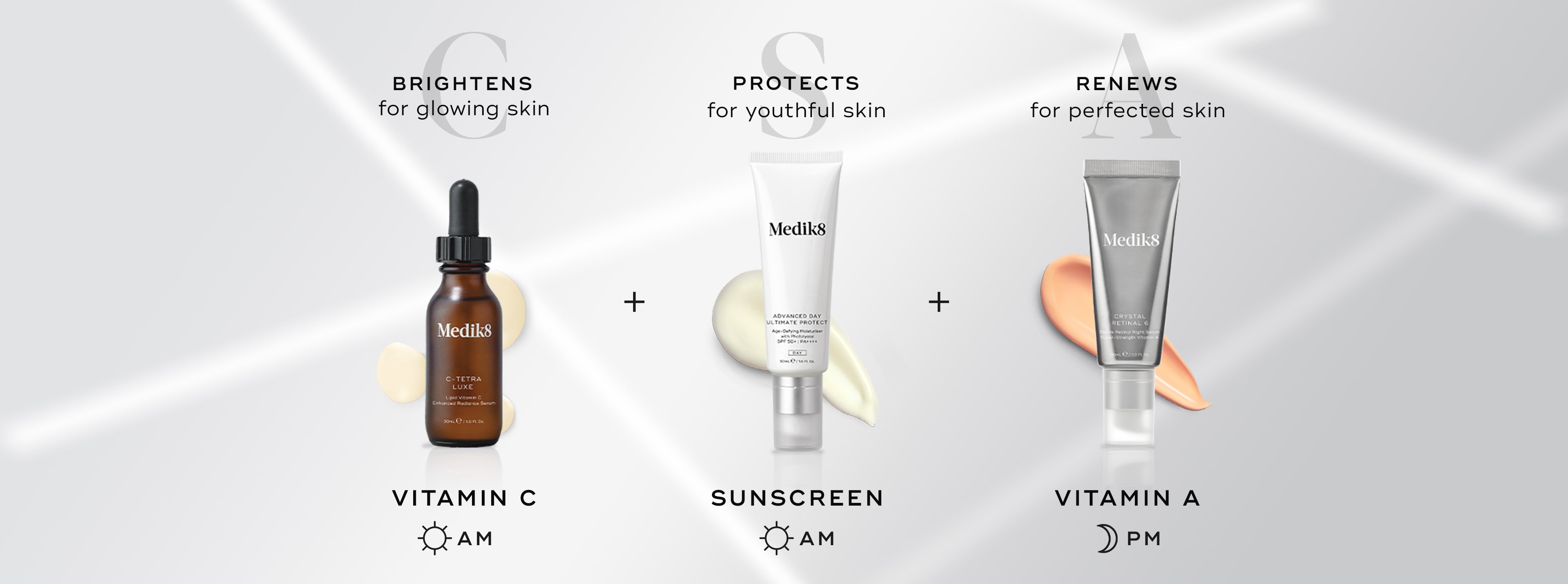 Weet je niet zeker waar te beginnen met je huidverzorging? Ontdek de eenvoudige, wetenschappelijk bewezen aanpak voor een jeugdige, stralende huid – zowel direct als op de lange termijn. Het is zo makkelijk als het gebruik van vitamine C plus SPF in de ochtend en vitamine A (ook bekend als retinol/retinal) in de avond. Wij noemen dit de CSA-filosofie. Bij Medik8 geloven we er sterk in dat iedere goede huidverzorgingsroutine moet starten met deze 3 fundamentele formules. Laat ons je laten zien waarom…