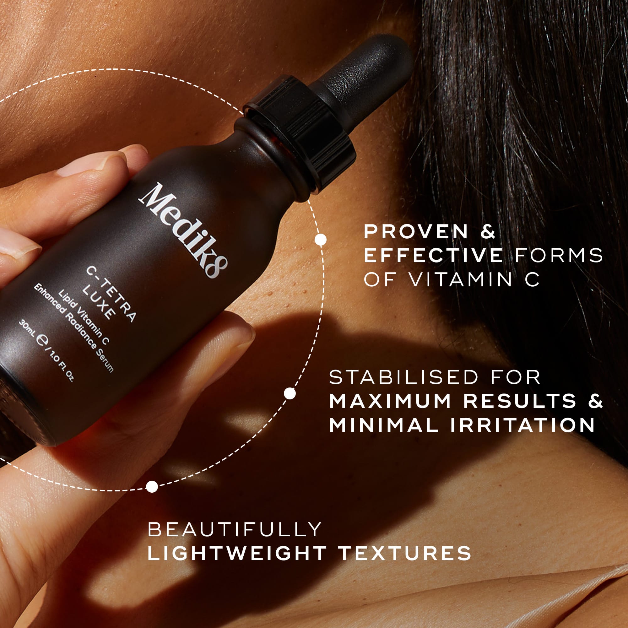 Verhoog en behoud de zichtbare leeftijdsverzachtende voordelen van vitamine C door het te combineren met zonnebrandcrème en vitamine A - volgens Medik8's baanbrekende CSA PhilosophyⓇ, die vitamine C plus zonnebrandcrème voorschrijft voor overdag en vitamine A voor 's nachts. Volg deze eenvoudige, klinisch bewezen benadering voor een stralende, jeugdige huid.